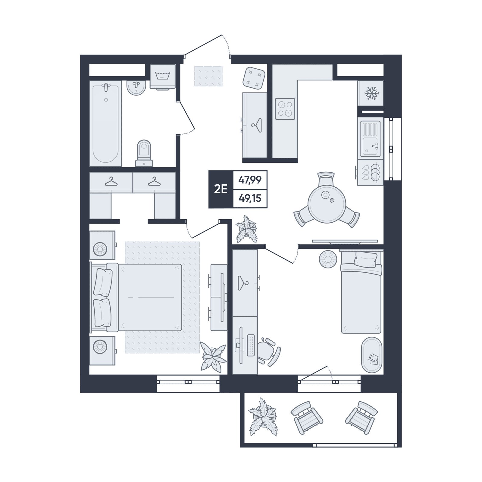 На 48 м² гармонично размещены две отдельные спальни и просторная кухня‑гостиная площадью почти 50 м² — настоящее сердце дома. Это пространство для встреч, общения и творчества.